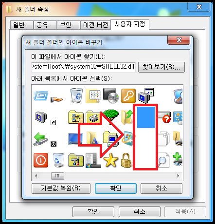 그럼 폴더의 아이콘 바꾸기 새창이 열리고 폴더의 아이콘 이미지를 변경할 수 있는 다양한 아이콘이 있는데 아무 아이콘이나 하나 클릭하고 키보드를 이용해 -> 오른쪽으로 넘기다 보면 아이콘이 없는 공란이 확인됩니다. 아이콘이 없는 부분을 선택하고 확인 > 새폴더 속성에서도 확인을 눌러주세요.