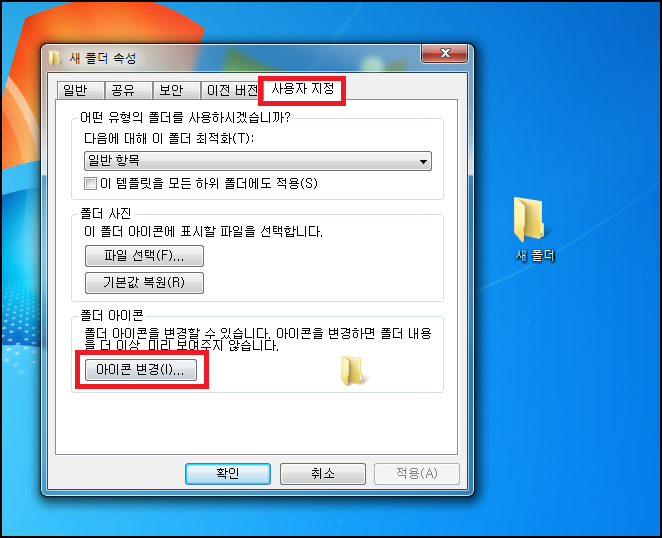 속성 메뉴가 나타나면 상단 "사용자 지정" 탭 > "아이콘 변경"을 눌러주세요.
