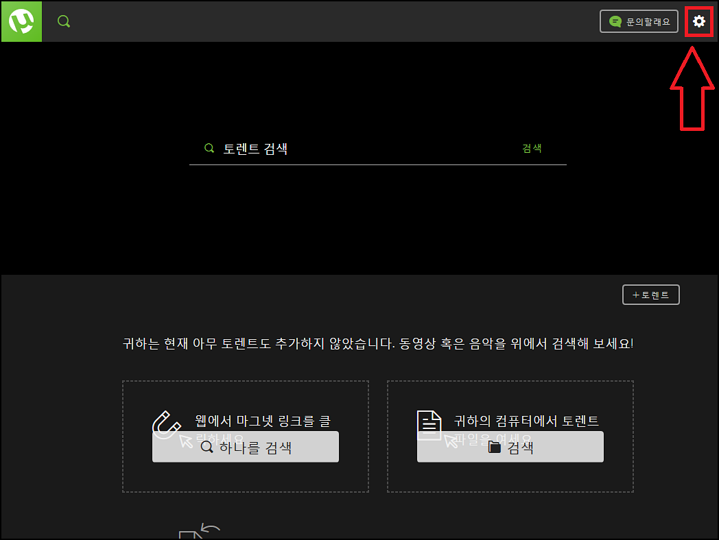 유토렌트 웹 프로그램을 실행한 화면인데요. 우측 상단 톱니바퀴 모양으로 다양한 설정이 가능합니다.