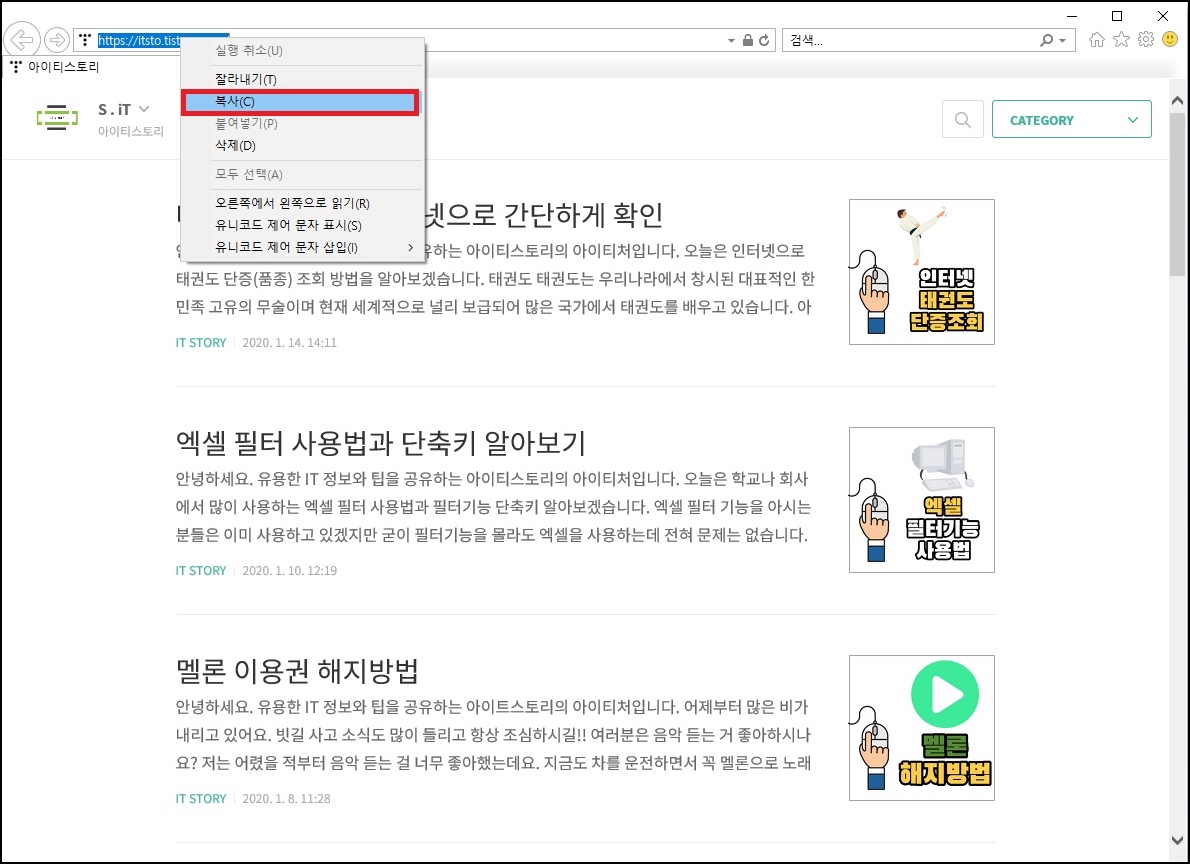 잠시 엑셀 창을 내리고 "바로가기" 글자를 눌렀을 때 연결될 웹 사이트 주소를 복사합니다.