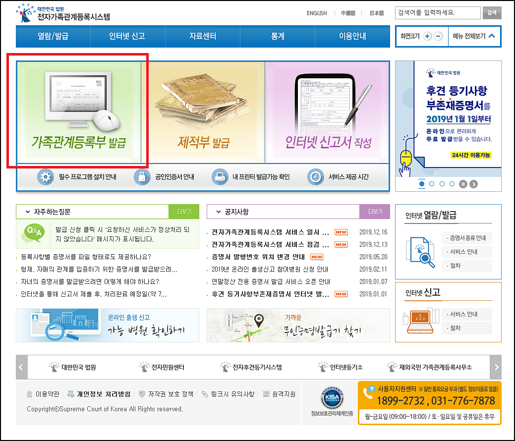 사이트로 접속하면 메인화면에 "가족관계등록부 발급" 메뉴가 크게 확인됩니다. 클릭해주세요.