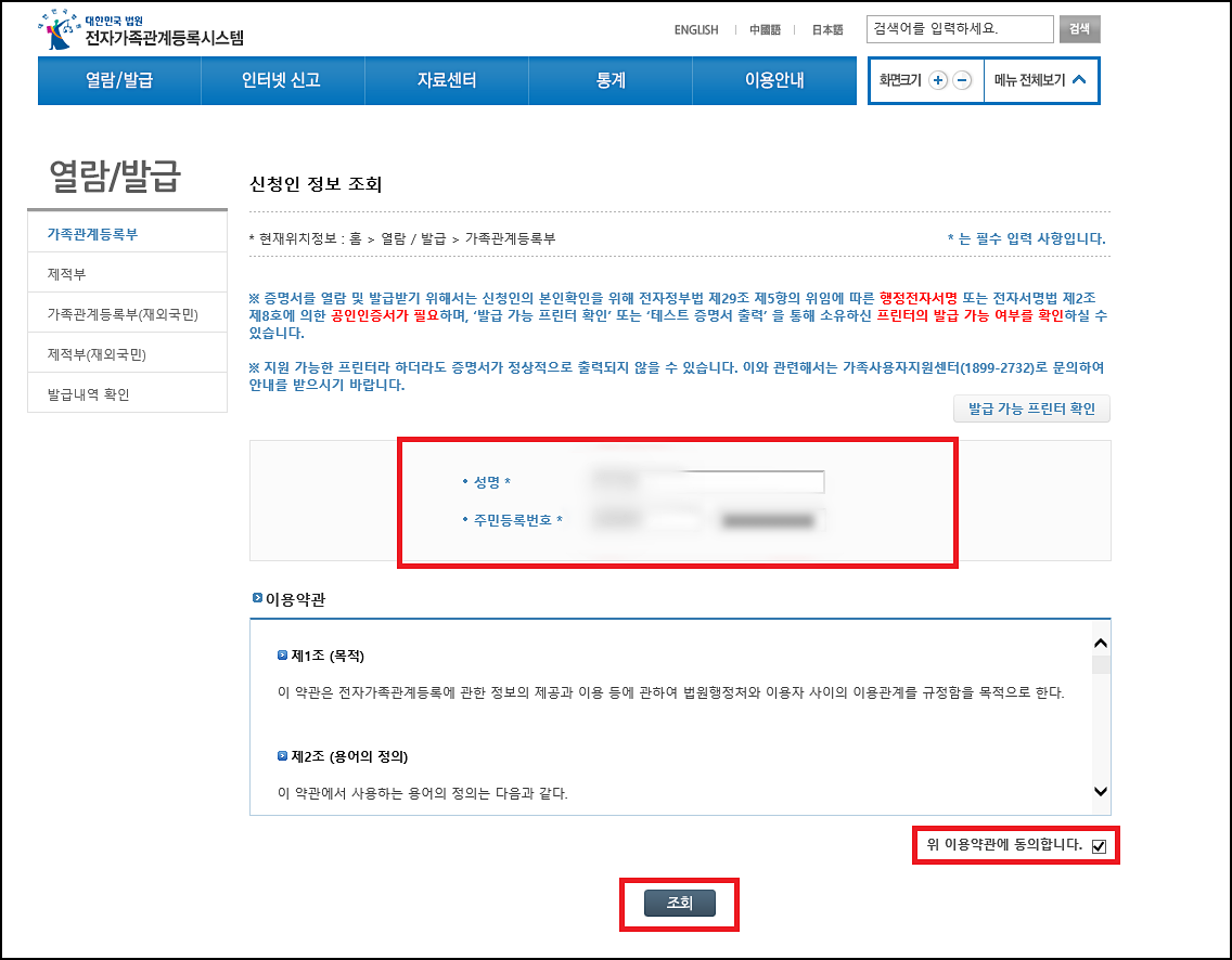 테스트 증명서 출력이 확인되었으면 신청인 정보 조회 - 이름과, 주민등록번호를 입력하시고 하단의 이용약관 동의 체크 후 조회 클릭!