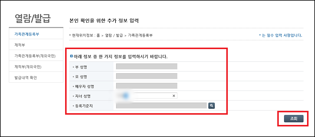 공인인증서 로그인이 되었다면 본인 확인을 위한 추가 정보 입력이 필요합니다. 부, 모, 배우자, 자녀, 등록기준지 중 하나를 선택해서 입력합니다.