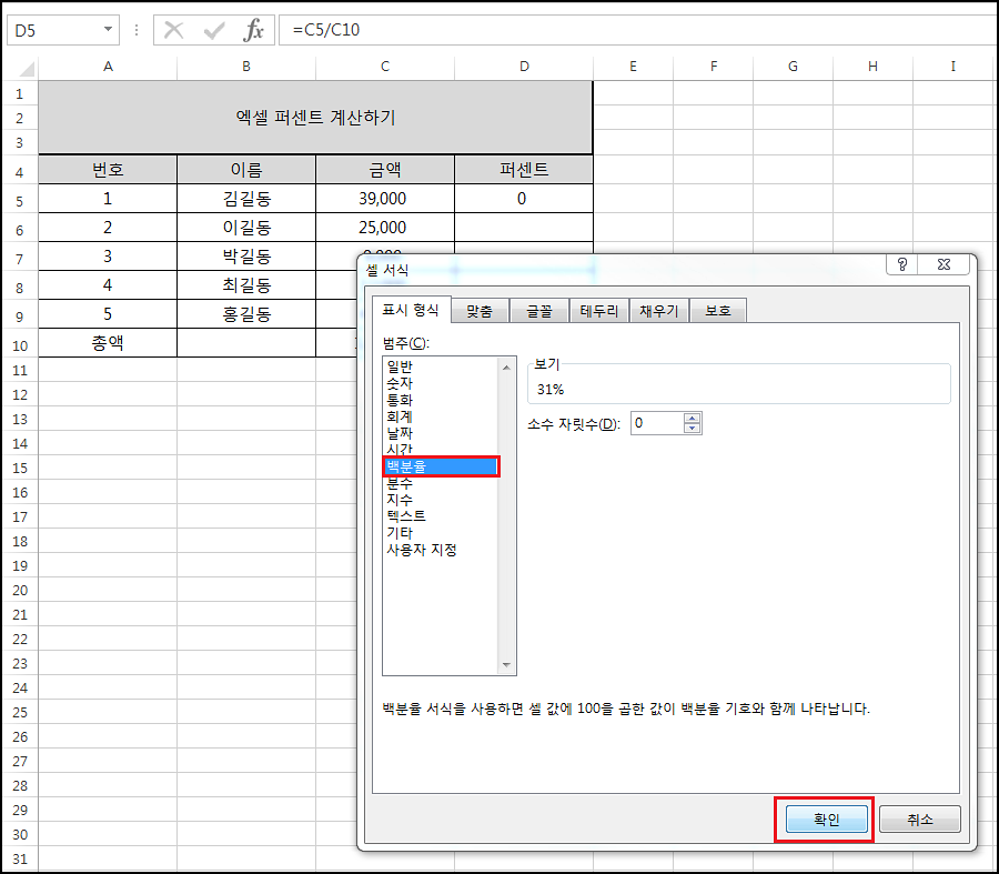 표시 형식 탭에서 중간쯤 백분율 선택 후 확인을 눌러줍니다.