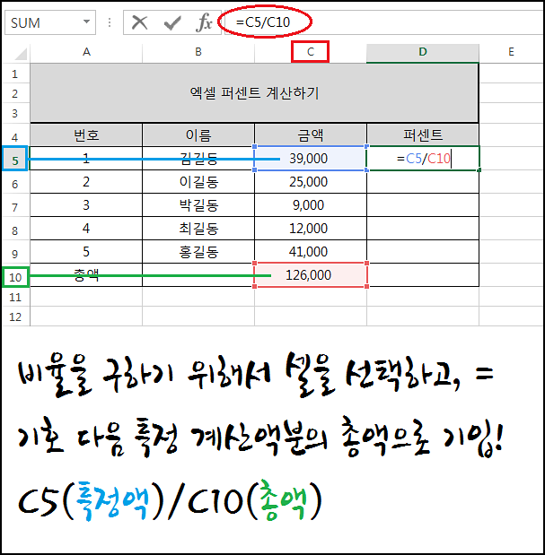김길동이라는 사람이 지불한 금액 39,000원은 엑셀에서 C행 5번 열에 입력되어 있고 총액은 C행 10번 열에 입력되어 있습니다. 이렇게 되면 처음 입력 값은 기호 =C5 분의 총액이니까 =C5/C10이 되겠죠?
