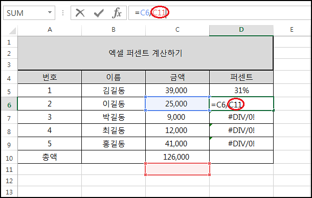 자동채우기로 모든 셀의 값을 편하게 입력했지만 수식에 오류가 발생해서 찾고자 하는 값이 정상적으로 나오지 않았어요. 셀을 살펴보니 =C6/C11로 확인이 됩니다. 다음 특정액인 C6은 제대로 입력이 되었지만 자동채우기를 하면 총액 셀이 한 칸씩 밑으로 밀려내려가면서 오류가 발생한 것입니다. 자동채우기를 진행하면 특정액의 셀은 한 칸씩 밀리는 것이 맞지만 총액의 셀은 지정된 자리에 있기 때문에 오류가 발생한 것입니다.