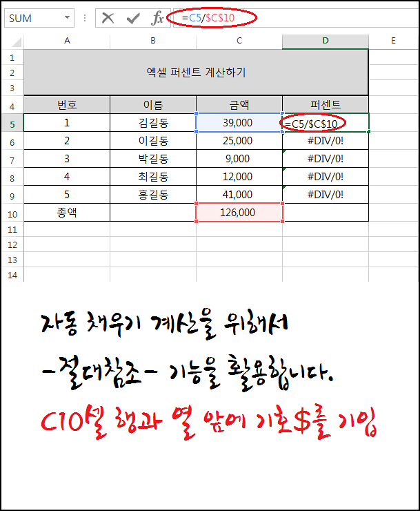 이 오류를 해결하기 위해서 "절대참조" 기능을 활용하시면 됩니다. 총액의 C10셀 행과 열 앞에 기호$를 입력해주세요. 그리고 다시 자동채우기를 진행하면 아래의 셀 모두 오류 없이 퍼센트 값이 계산됩니다.