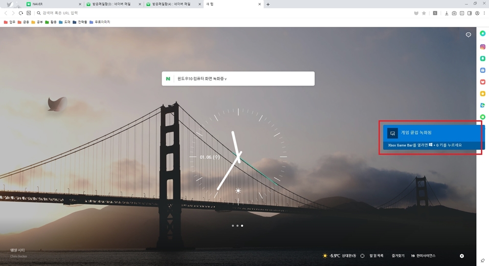 그럼 이미지와 같이 실시간으로 컴퓨터 화면을 녹화, 캡처할 수 있는 Xbox Gme Bar가 실행되고 좌측 상단 동그란 점 모양을 클릭하게 되면 녹화가 진행됩니다.