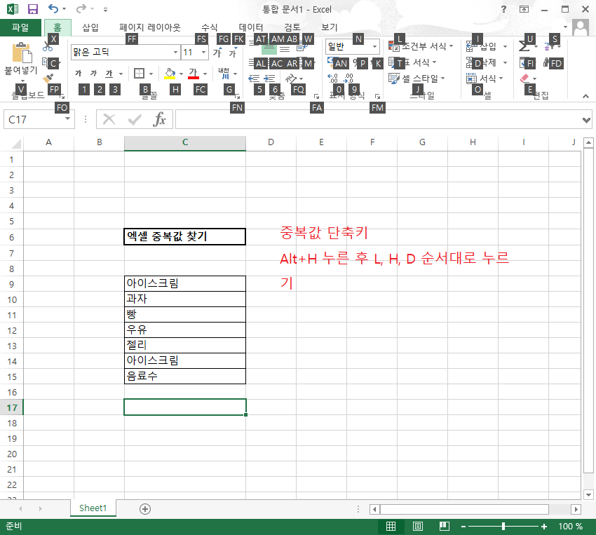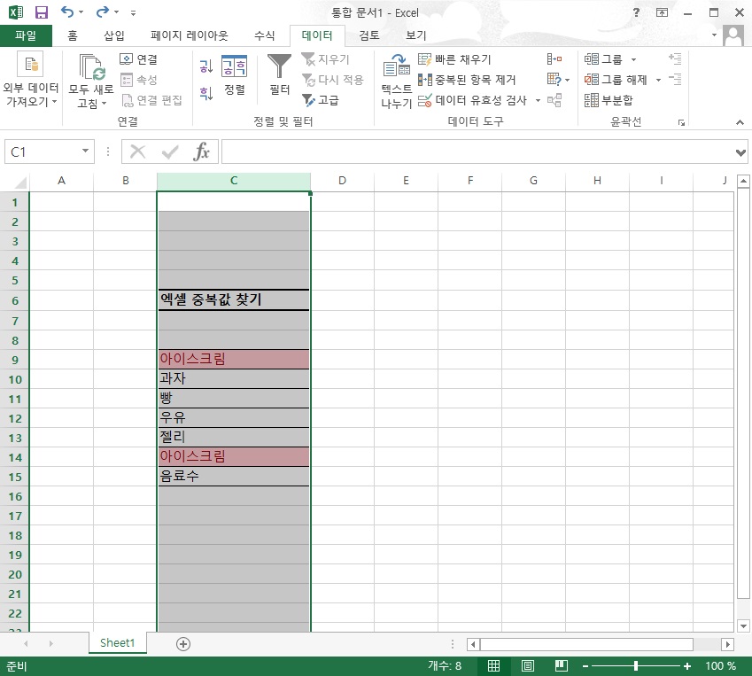 아이스크림이라는 중복값이 적색 배경으로 표시된 게 확인되시죠?