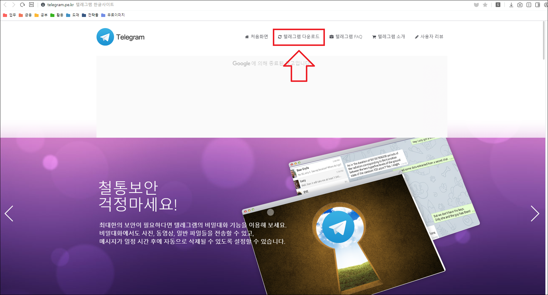 검색 결과 최상단에 [텔레그램 한글사이트]를 클릭해주시면 텔레그램 PC버전 설치 가능한 사이트로 이동합니다.