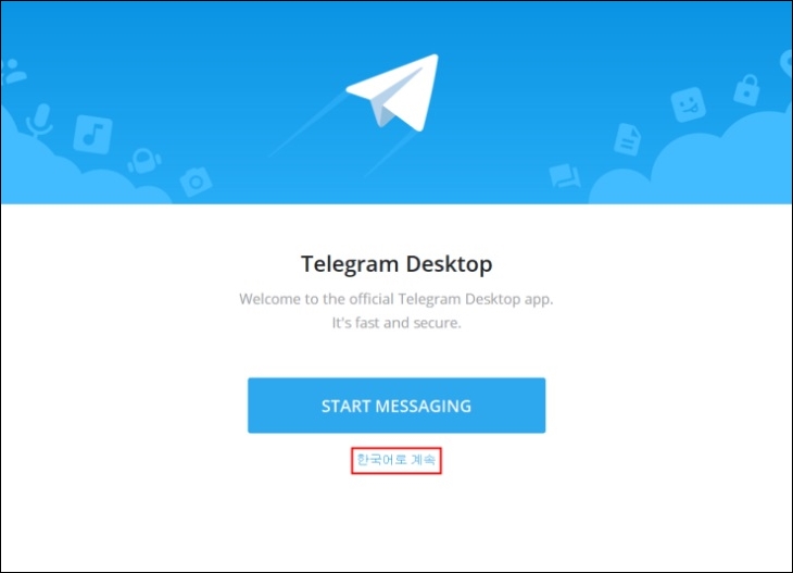 설치된 텔레그램을 실행하면 설치시 선택 언어가 영어였기 때문에 영어로 시작되지만 바로 아래 "한국어로 계속" 버튼을 클릭하면 한국어로 사용이 가능합니다.