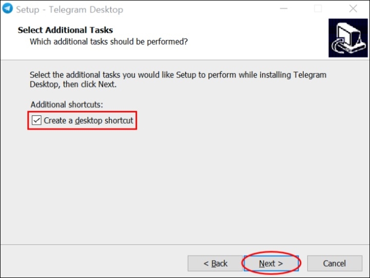 다음은 윈도 시작 메뉴에 텔레그램 바로가기를 추가할 것인지 확인하는 화면입니다. 저는 굳이 시작메뉴에 필요하지 않을것 같아 체크박스에 체크 후 넥스트를 누르겠습니다.